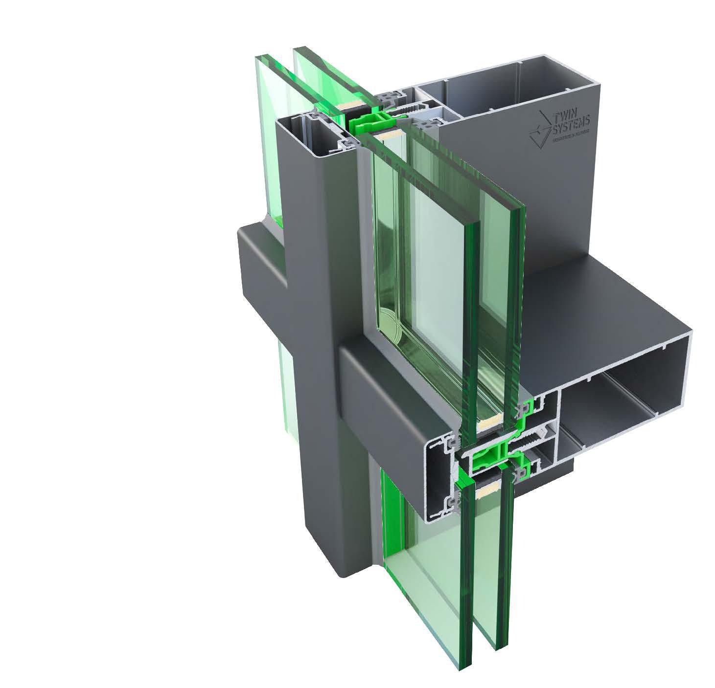 Facciata tradizionale a montanti e traversi con copertina esterna Isolamento acustico e termico; Impiego del sistema per molteplici tipi di realizzazione; Struttura portante leggera con notevole facilità di montaggio; Aspetto estetico personalizzabile tramite copertine esterne – Integrazione con apertura a sporgere nascosta e di tutte le aperture a battente delle serie TWIN.