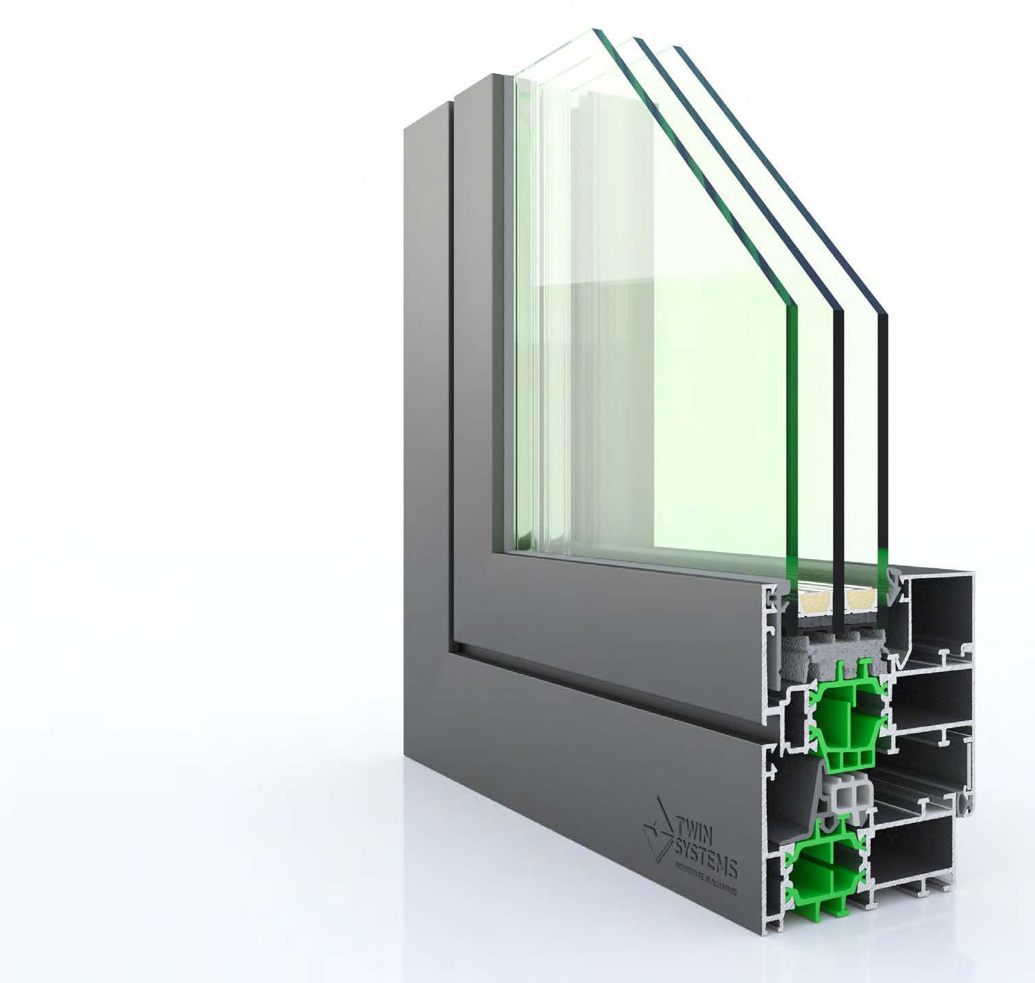 Profili per finestre che consentono la realizzazione di serramenti a una, due o più ante, nella versione a giunzione aperta complanari all'esterno e sovrapposte all'interno. Sono possibili anche finestre fisse, a vasistas e a ribalta. Profili per porte: consentono la realizzazione di porte a una o due ante, apribili dall'interno, con sovrapposizioni fisse o apribili e vetrine.